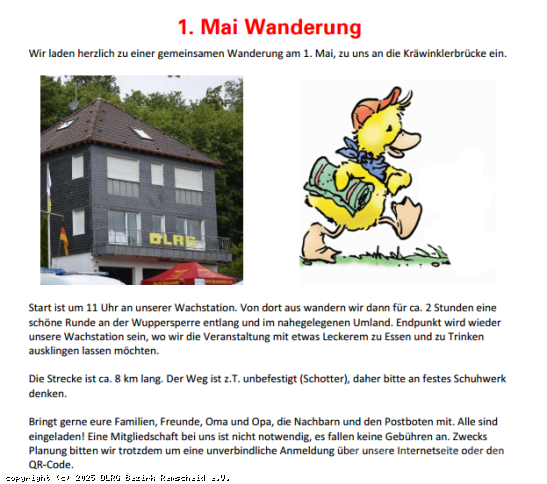 Wir laden herzlich zu einer gemeinsamen Wanderung am 1. Mai, zu uns an die Kräwinklerbrücke ein. Start ist um 11 Uhr an unserer Wachstation. Von dort aus wandern wir dann für ca. 2 Stunden eine schöne Runde an der Wuppersperre entlang und im nahegelegenen Umland. Endpunkt wird wieder unsere Wachstation sein, wo wir die Veranstaltung mit etwas Leckerem zu Essen und zu Trinken ausklingen lassen möchten. Die Strecke ist ca. 8 km lang. Der Weg ist z.T. unbefestigt (Schotter), daher bitte an festes Schuhwerk denken. Bringt gerne eure Familien, Freunde, Oma und Opa, die Nachbarn und den Postboten mit. Alle sind eingeladen! Eine Mitgliedschaft bei uns ist nicht notwendig, es fallen keine Gebühren an. Zwecks Planung bitten wir trotzdem um eine un ... Mehr erfahren