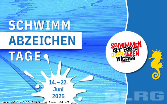 Sicher schwimmen zu können kann mit Blick auf die nächste Badesaison überlebenswichtig sein. Nur so kann der Spaß am und im Wasser problemlos genossen werden. Diese Bedeutung wollen die schwimmsporttreibenden Verbände in Deutschland mit den bundesweiten Schwimmabzeichentagen vom 14. bis 22. Juni ins öffentliche Bewusstsein rücken. Wir laden daher am 22. Juni ins Sportbad am Park (Schützenplatz 3, 42853 Remscheid) zum Schwimm-Check ein. In der Zeit von 10 bis 16 Uhr können Interessierte ihr Können unter Beweis stellen und eines der Deutschen Schwimmabzeichen Bronze, Silber und Gold ablegen. Für Schwimmanfänger nehmen unsere Schwimmausbilder auch das Seepferdchen ab. Jeder kann am Aktionstag im Sportbad ein Abzeichen ablegen. Unsere kompetenten Prüferinnen und Prüfer stehen dafür zur V ... Mehr erfahren
